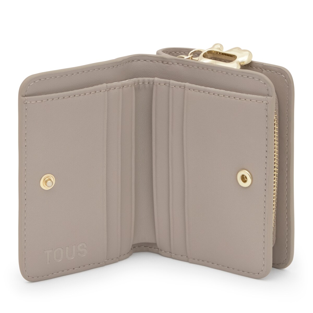 Кошелек TOUS из коллекции Fold бежевого цвета. Материал: натуральная кожа. Застежка на кнопку. Отделение для монет на молнии. 8 слотов для карт и одно открытое отделение для купюр. Размеры (высота х ширина х глубина): 8 х 11 х 3 см.