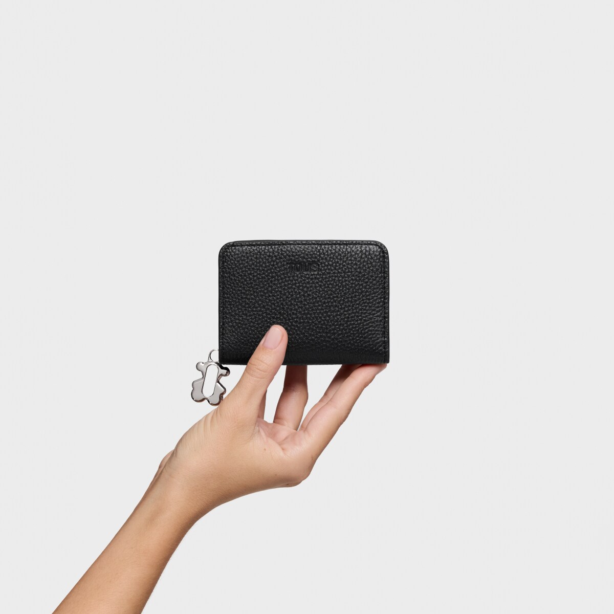 Кошелек TOUS из коллекции Fold черного цвета. Материал: натуральная кожа. Застежка на кнопку. Отделение для монет на молнии. 8 слотов для карт и одно открытое отделение для купюр. Размеры (высота х ширина х глубина): 8 х 11 х 3 см.