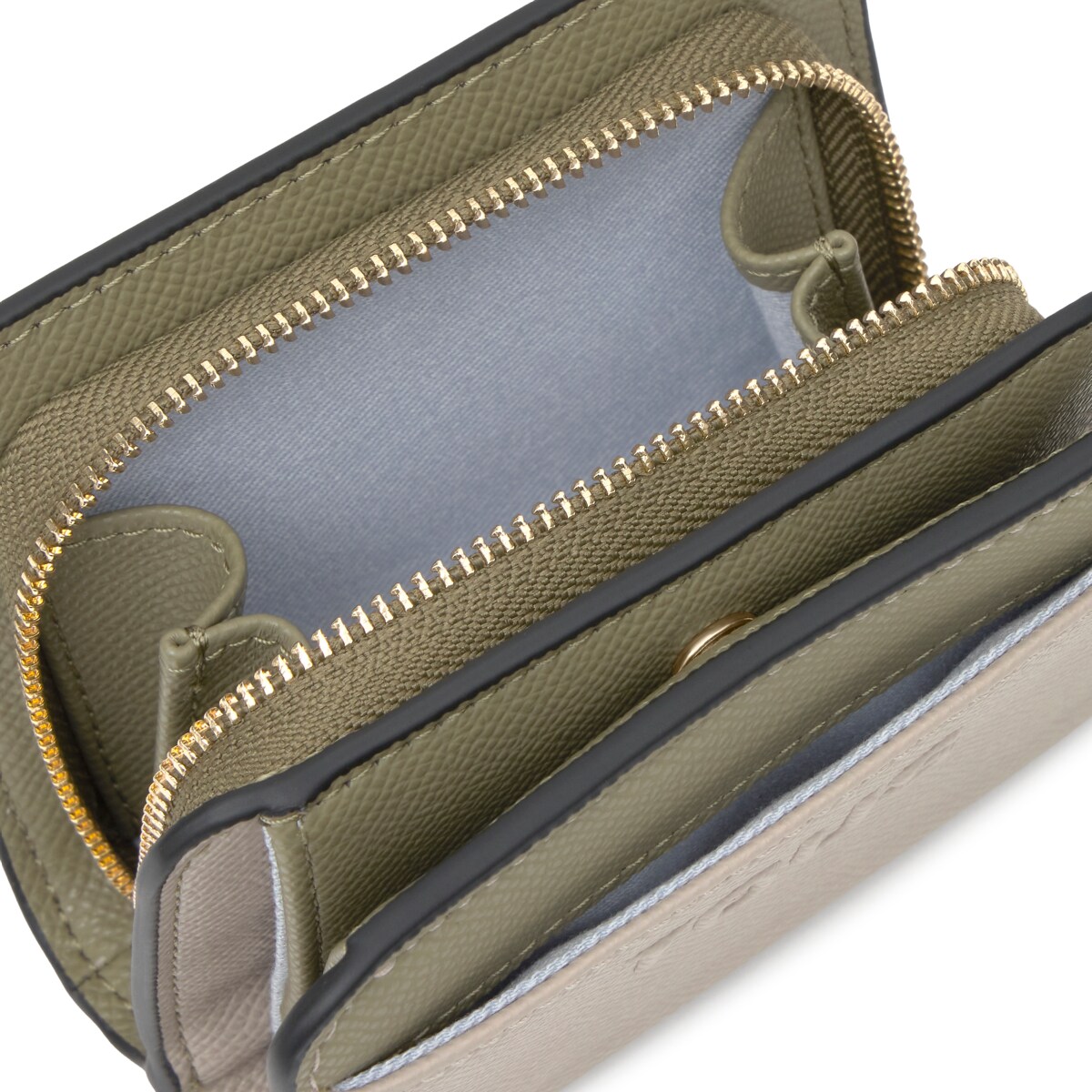 Кошелек TOUS из коллекции Добл Одри Саффиано (Doble Audree Saffiano) из полиуретана цвета тауп и хаки. Застежка на кнопку и молнию. Два основных отделения: одно на молнии, другое для карт. Размеры: 8,5 x 11 x 5,5 см.