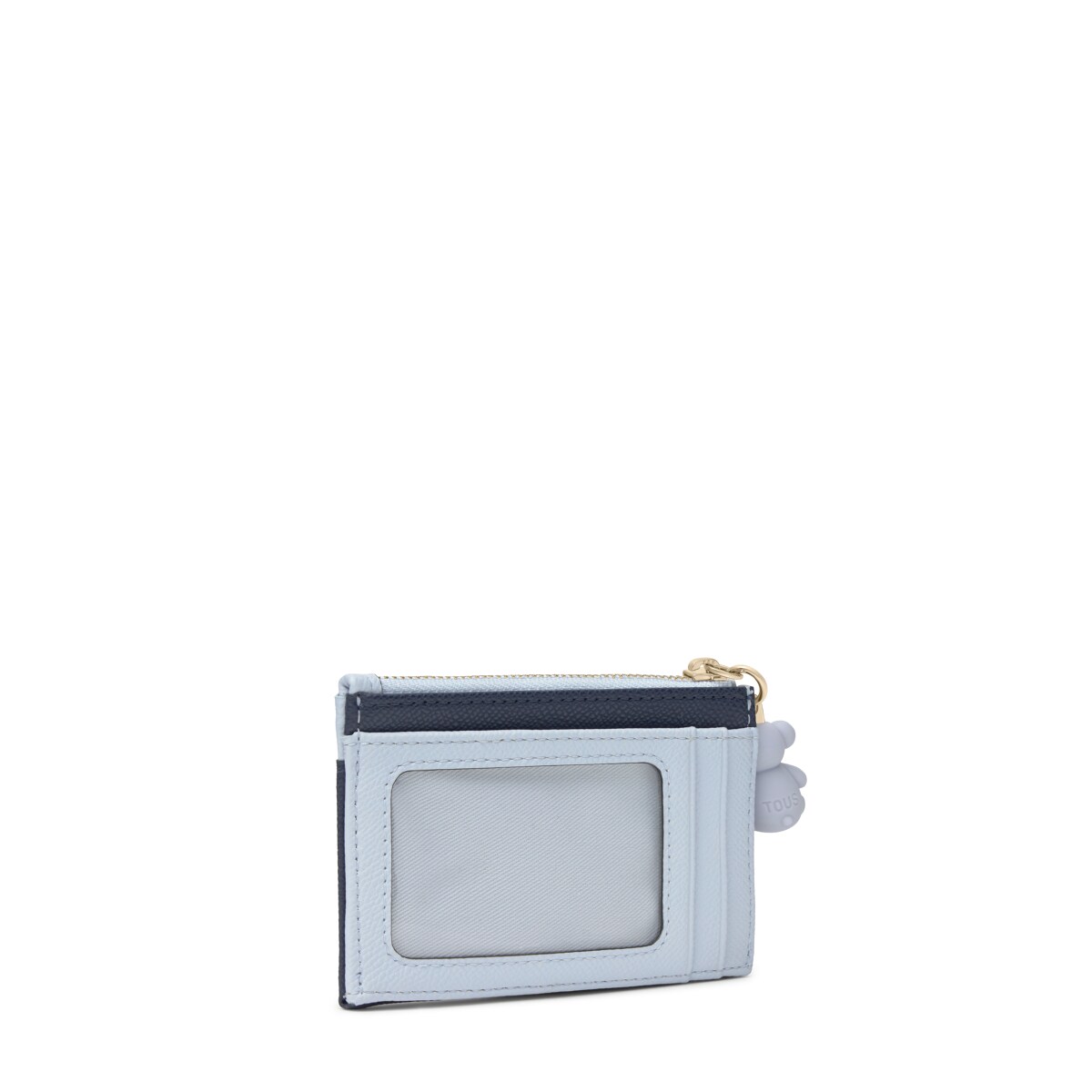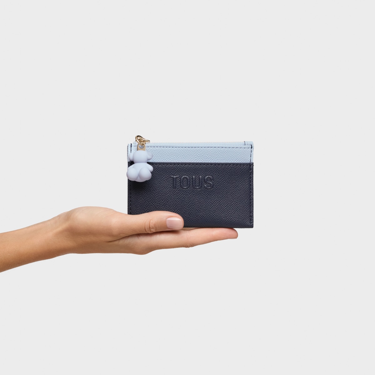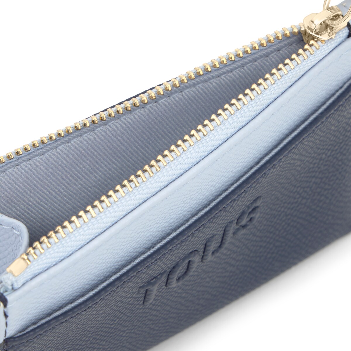 Монетница-картхолдер TOUS из коллекции Одри Саффиано (Audree Saffiano) из полиуретана темно-синего и голубого цвета. Имеется отделение для монет, закрывающееся на молнию. На задней стороне три слота для карт, один из которых прозрачный. Размеры (высота x ширина x глубина): 8 x 11,5 x 2 см.