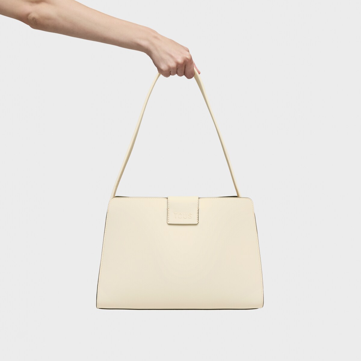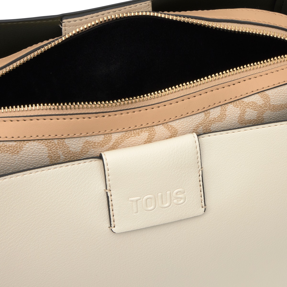 Сумка-тоут TOUS из коллекции Каос Айкон (Kaos Icon) из полиуретана бежевого и песочного цвета. Застежка на магнитную кнопку. Внутренний карман на молнии. Фиксированный плечевой ремень. Размеры (высота x ширина x глубина): 18,5 x 33 x 24 см.