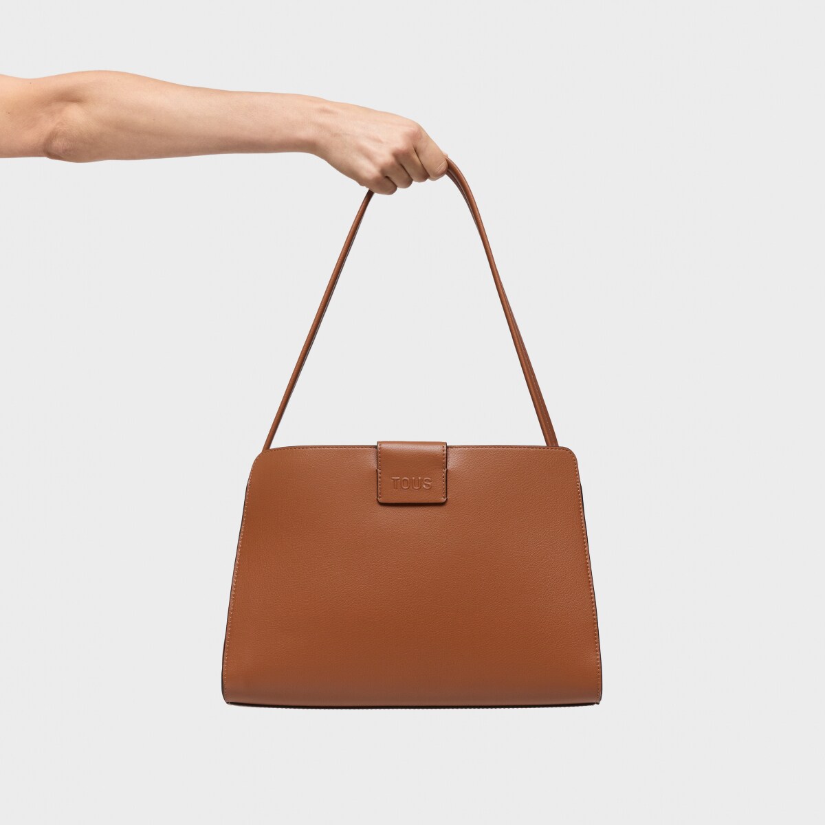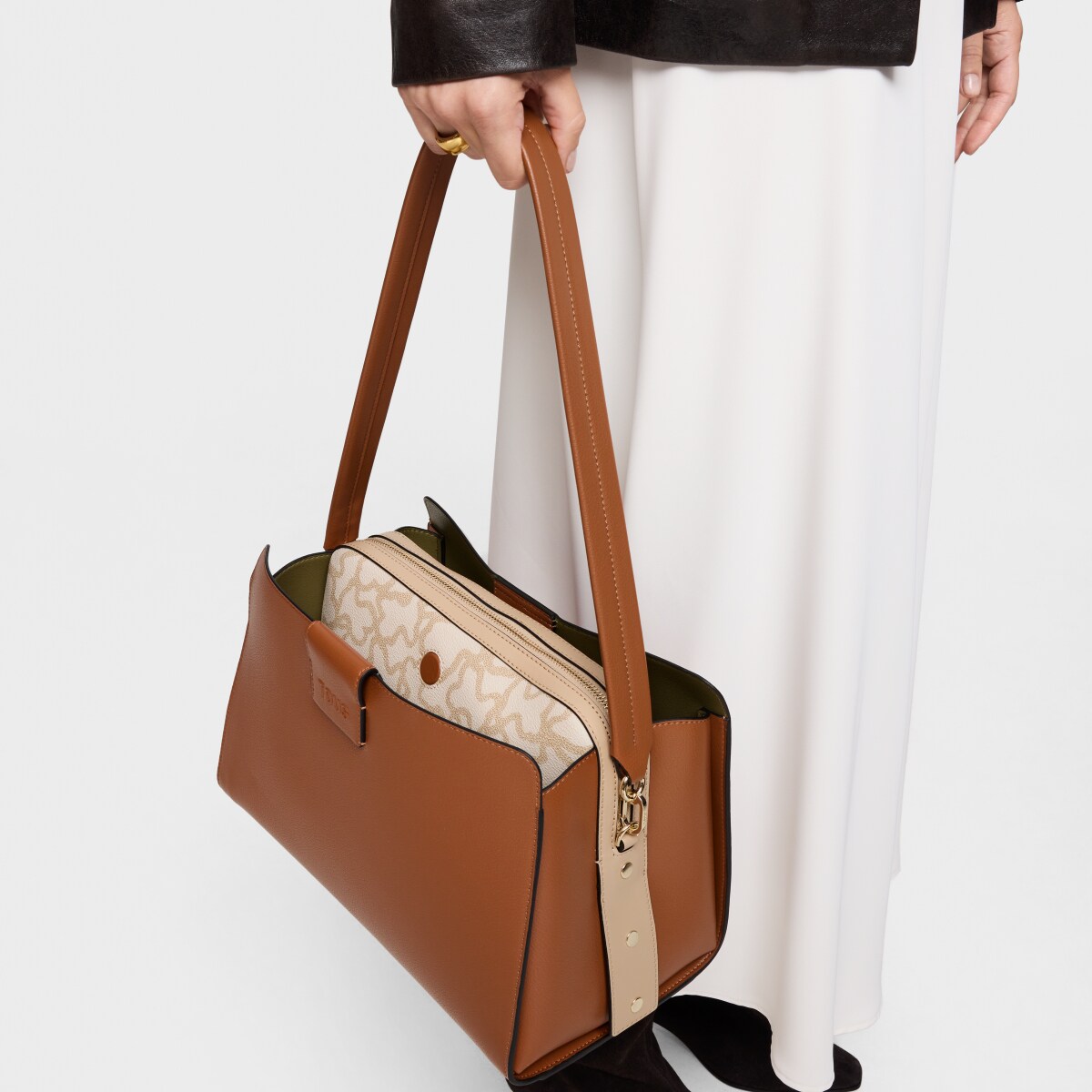 Сумка-тоут TOUS из коллекции Каос Айкон (Kaos Icon) из полиуретана коричневого и бежевого цвета. Застежка на магнитную кнопку. Внутренний карман на молнии. Фиксированный плечевой ремень. Размеры (высота x ширина x глубина): 18,5 x 33 x 24 см.