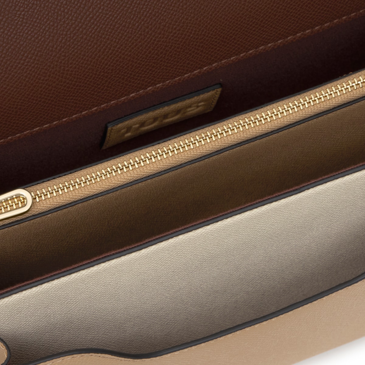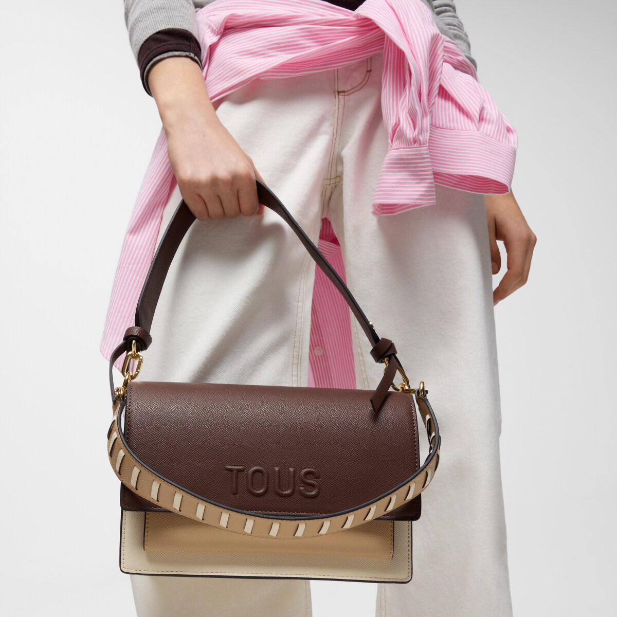 Сумка через плечо TOUS из коллекции Одри Саффиано (Audree Saffiano) среднего размера из полиуретана бежевого и коричневого цвета. Клапан с магнитной застежкой. Открытый внешний карман. Имеет два отделения, разделенных еще одним карманом на молнии. Съемный плечевой ремень и регулируемый съемный ремень для ношения через плечо. Размеры (высота х ширина х глубина): 17 х 25 х 12 см.