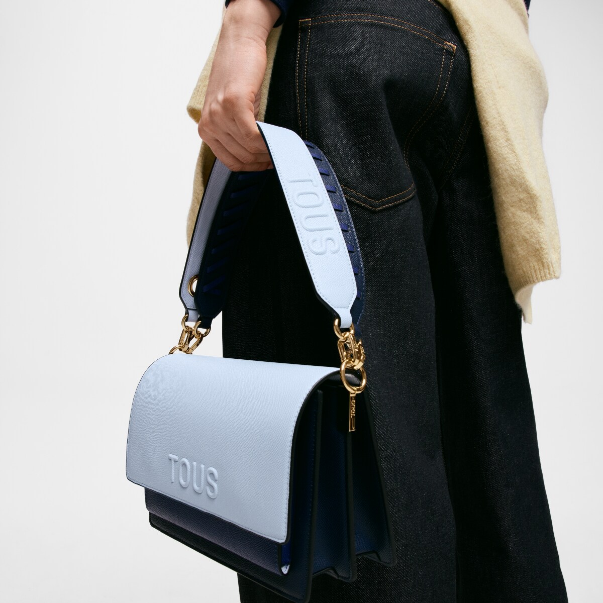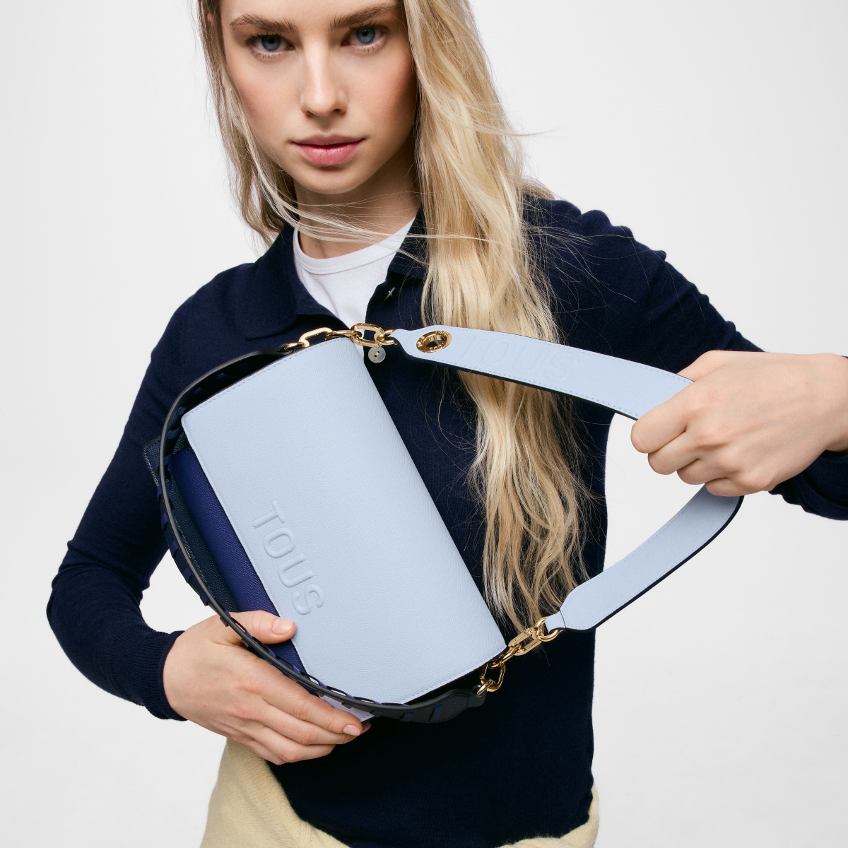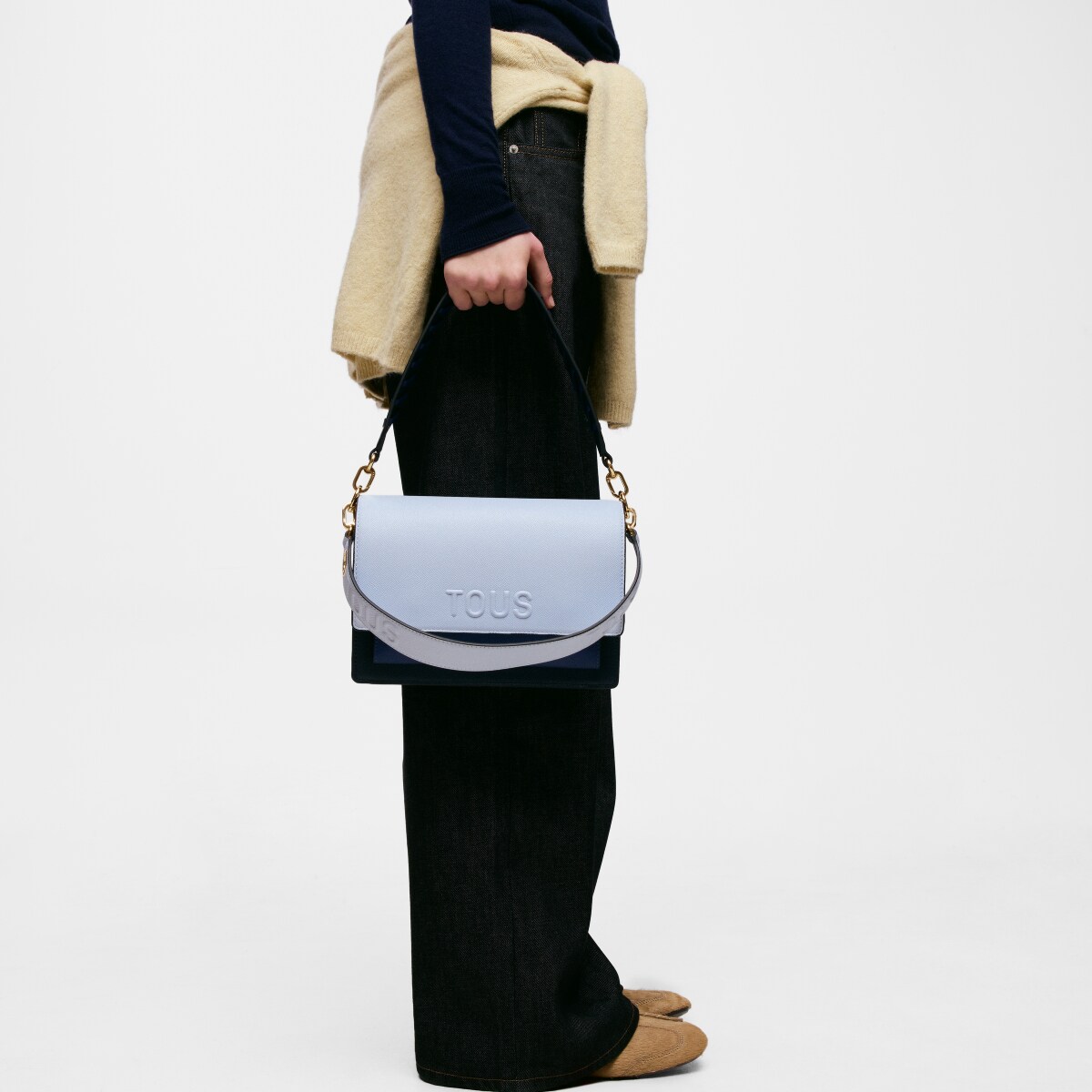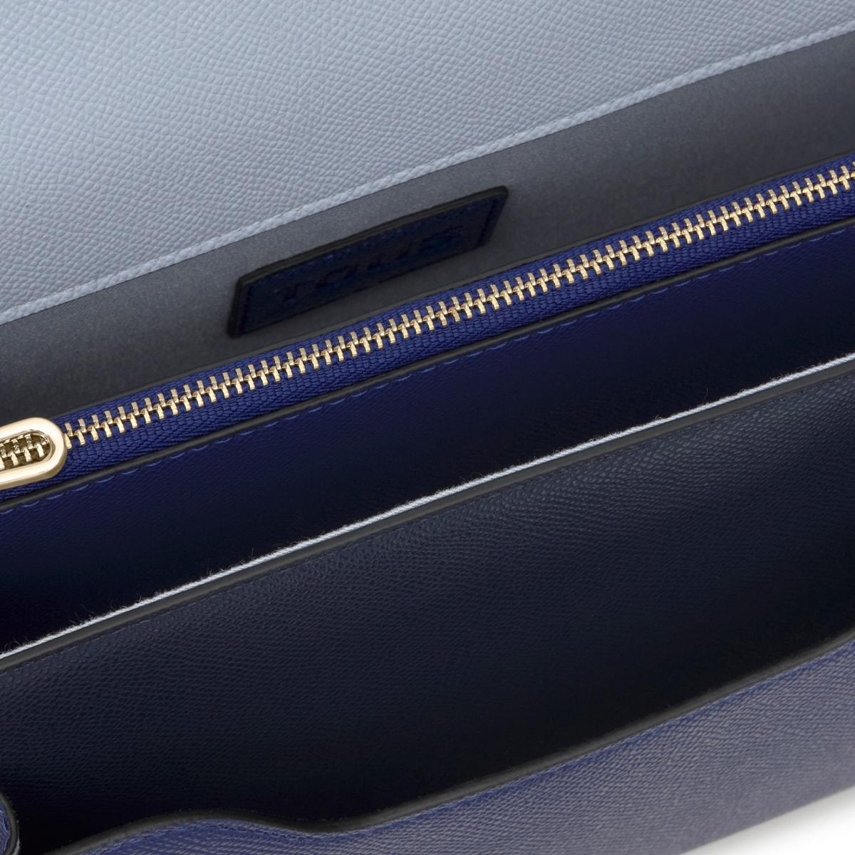 Сумка через плечо TOUS из коллекции Одри Саффиано (Audree Saffiano) среднего размера из полиуретана темно-синего и голубого цвета. Клапан с магнитной застежкой. Открытый внешний карман. Имеет два отделения, разделенных еще одним карманом на молнии. Съемный плечевой ремень и регулируемый съемный ремень для ношения через плечо. Размеры (высота х ширина х глубина): 17 х 25 х 12 см.