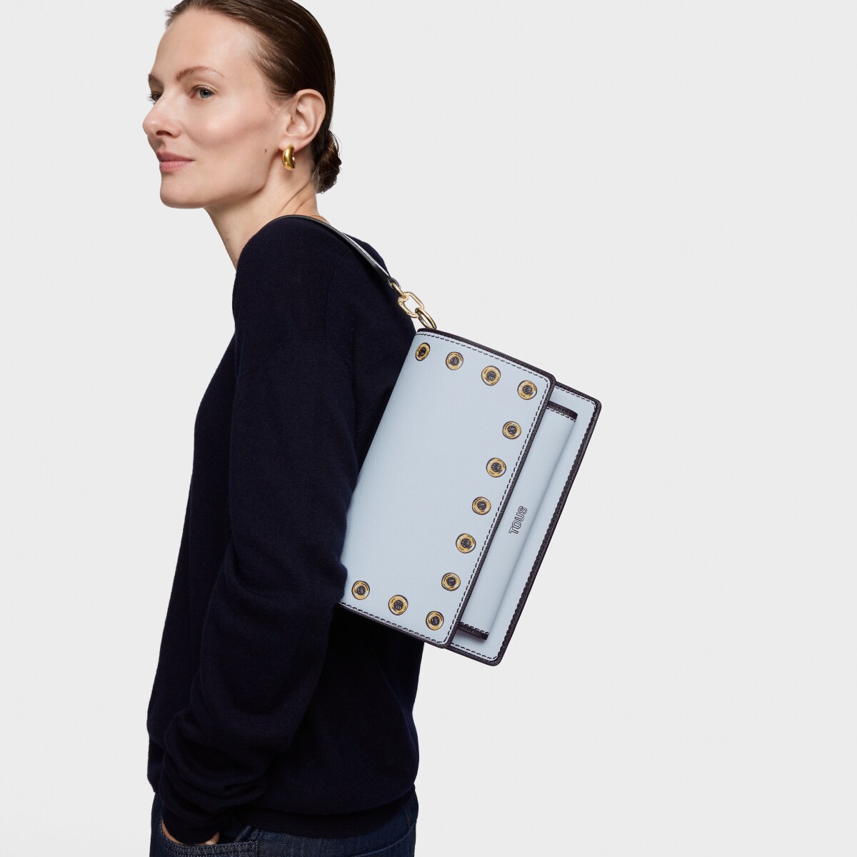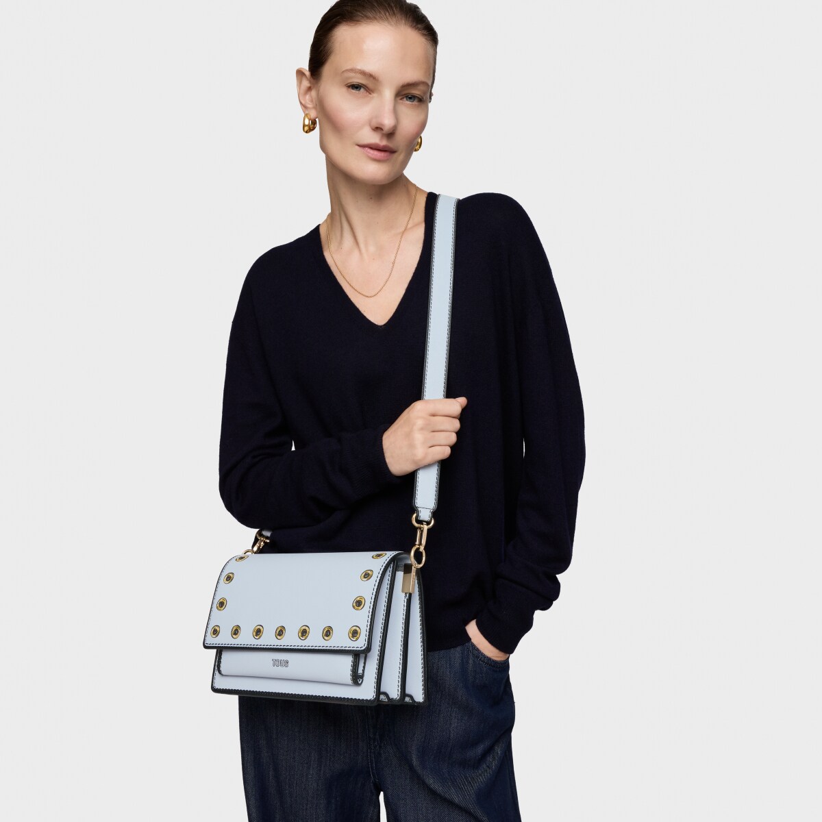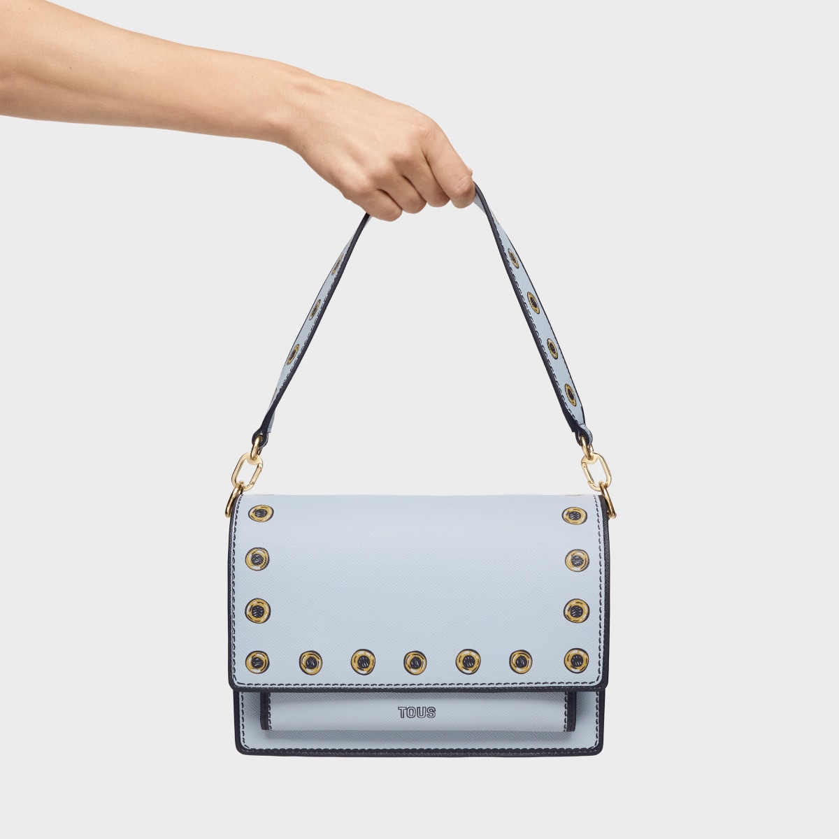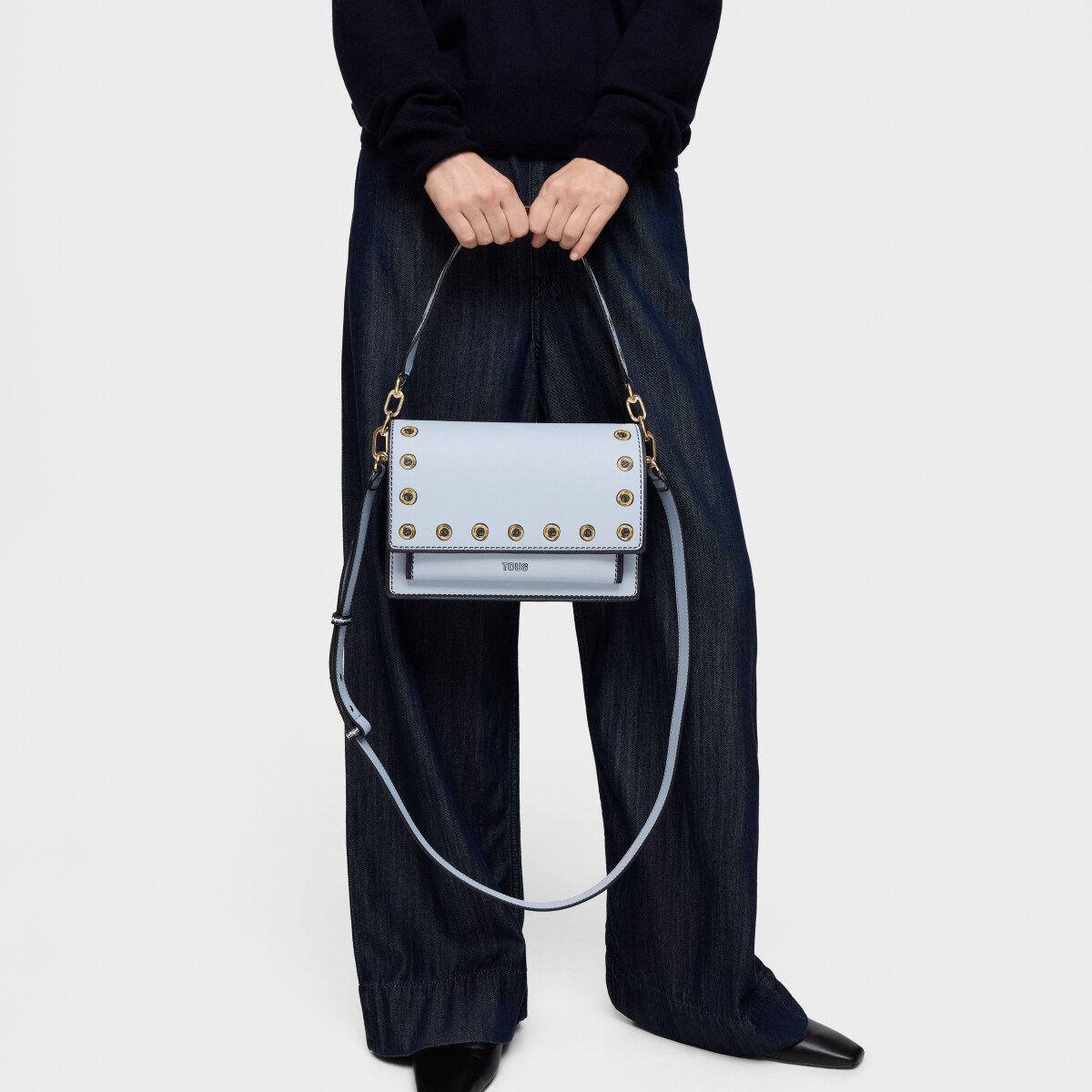 Сумка через плечо TOUS из коллекции Одри иллюзия (Audree Trampantojo) из искусственной кожи серо-голубого цвета. Материал: полиуретан. Имеет клапан и застежку на двух магнитных кнопках. Два отделения, разделенные одним отделением на молнии, и открытый карман спереди. Фиксированный плечевой ремень и регулируемый съемный ремень для ношения через плечо. Размеры (высота х ширина х глубина): 17 х 25 х 12 см. Минимальная длина ремня: 110 см. Максимальная длина ремня: 122 см.