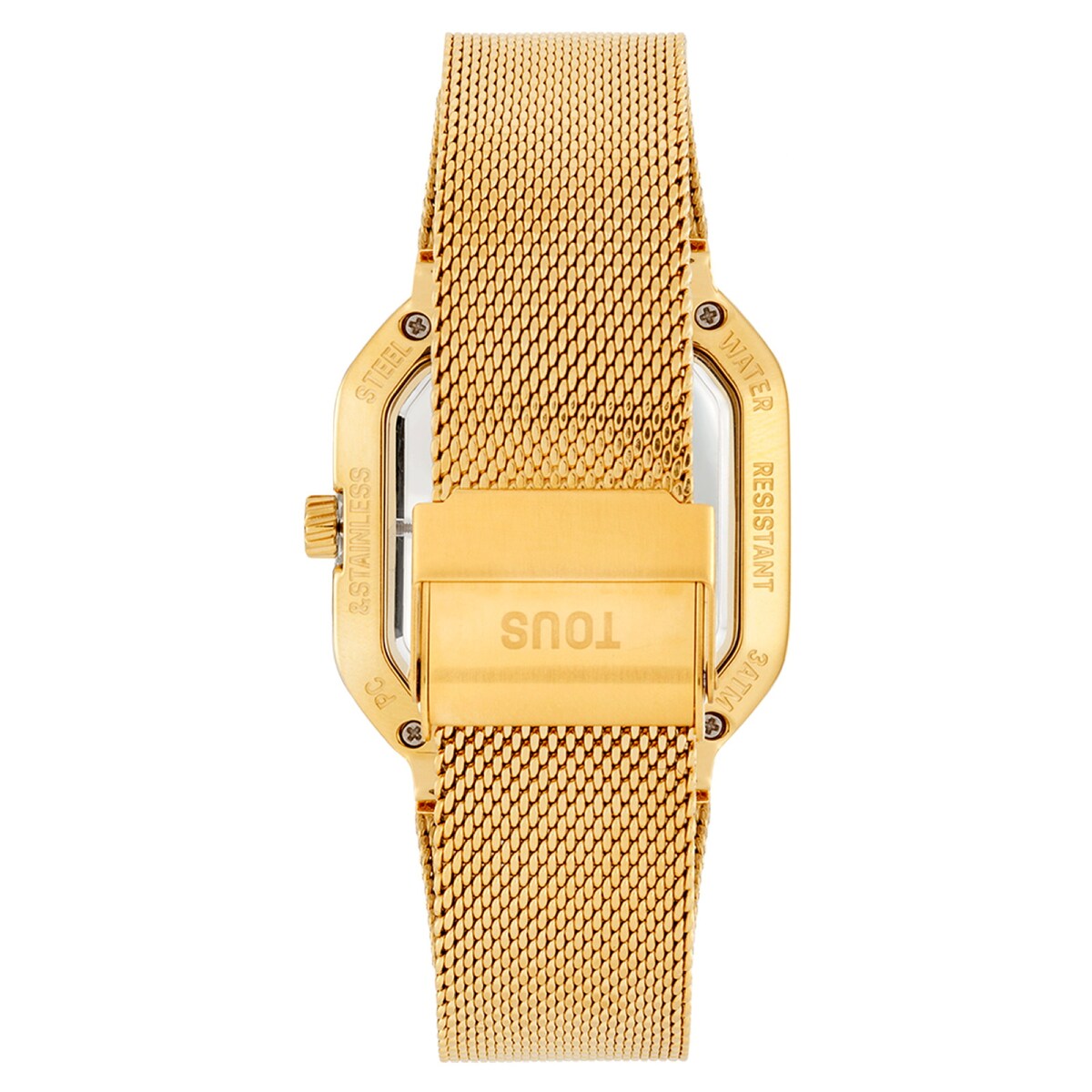Часы TOUS из коллекции D-Bear Party со стальным браслетом золотого цвета и прозрачным корпусом. Размеры: 36 мм x 48 мм. C акриловым ограненным медведем. Минеральное плоское, восьмиугольное стекло. Водонепроницаемость до 3 АТМ. Механизм: аналоговый японский кварцевый. Браслет: 23 мм x 18 мм x 74 мм / 23 мм x 18 мм x 105 мм.Функции: часы и минуты.