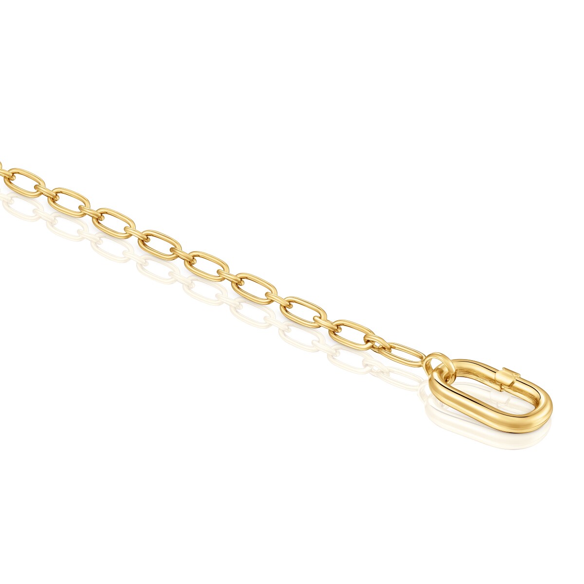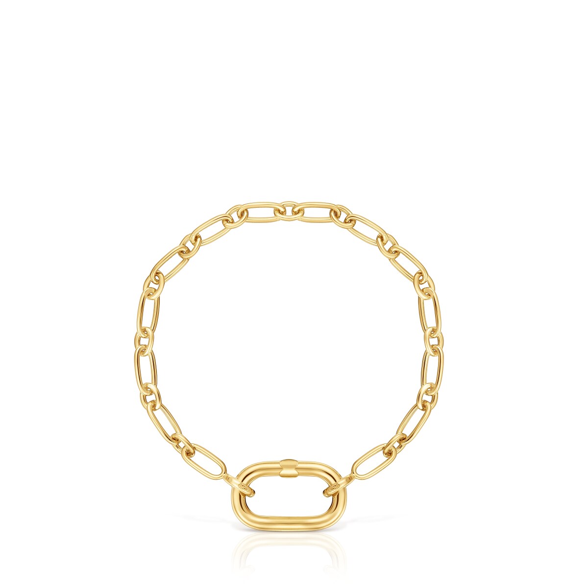 Браслет TOUS Hold Oval из желтого вермеля с карабином. Материал: Вермель – серебро 925 пробы с покрытием золота 750 пробы толщиной от 3 до 5 микрон, без каких-либо иных металлов между ними. Размер кольца: 20 мм. Длина браслета: 18 см.