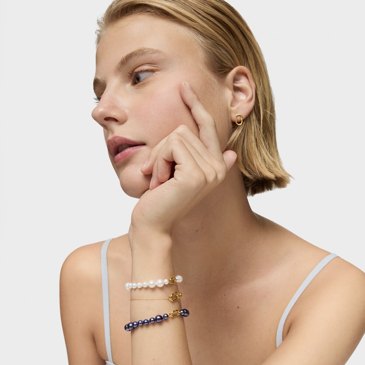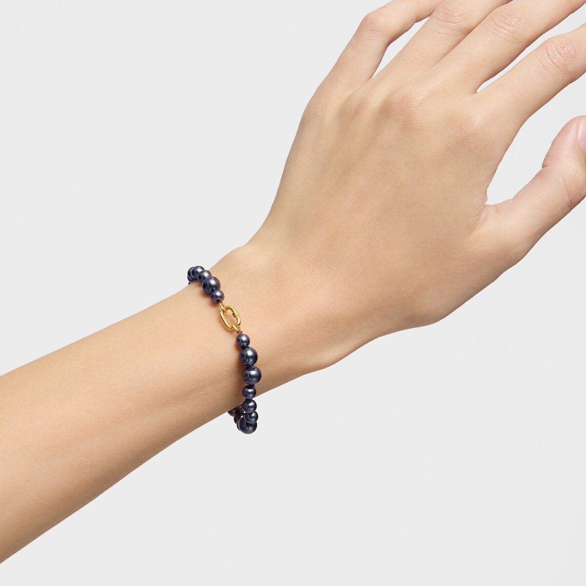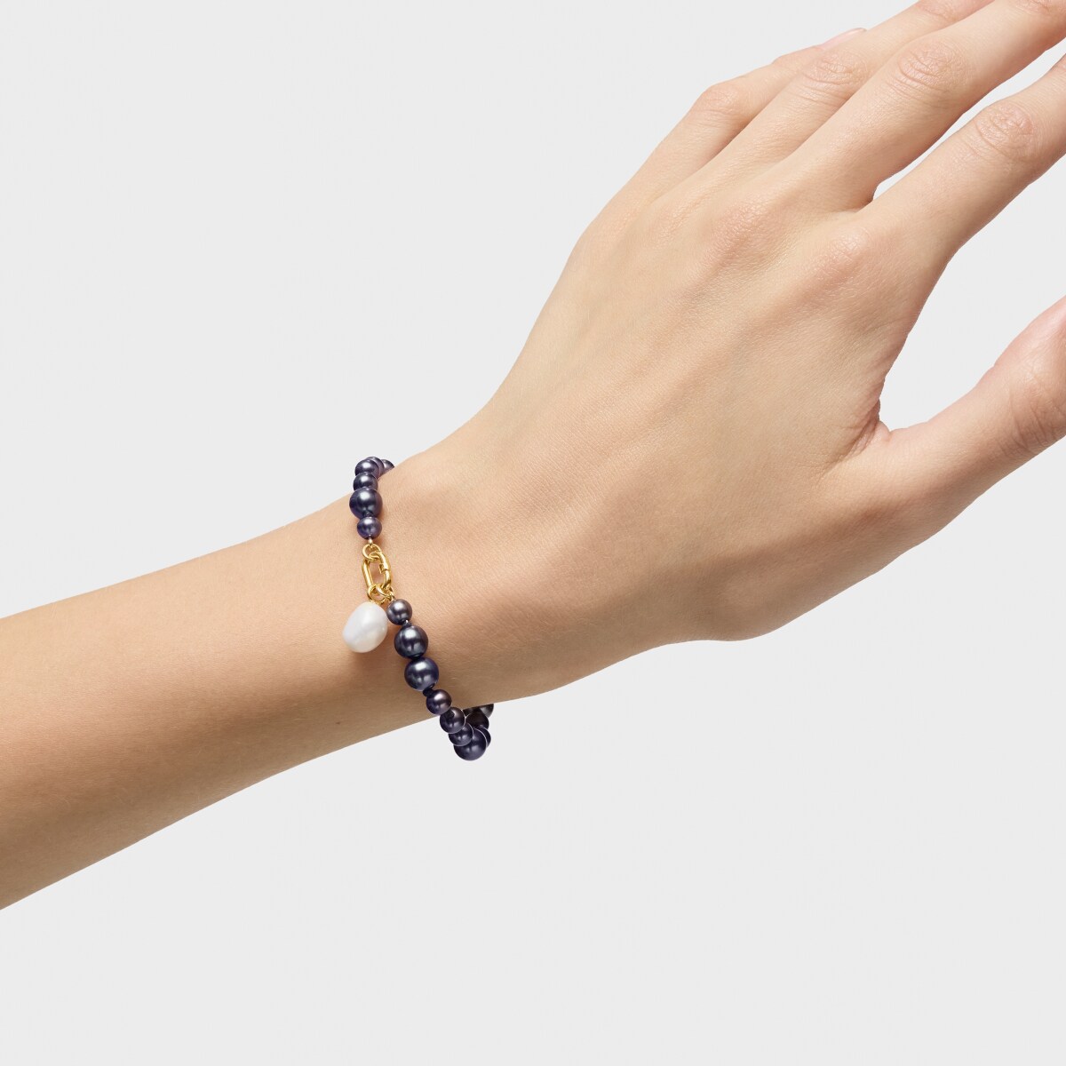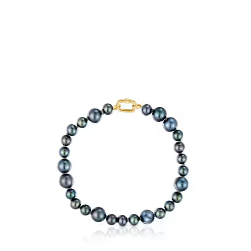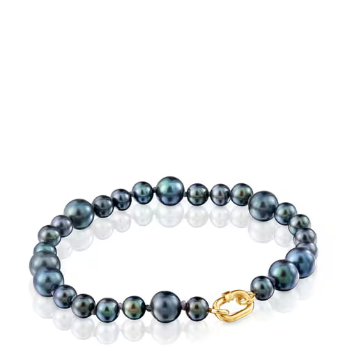 Браслет TOUS из коллекции Hold Oval из жёлтого золота с серым культивированным барочным жемчугом. Размер жемчужин: 5–7 мм. Общая длина: 17,5 см. Застёжка TOUS Hold Oval.