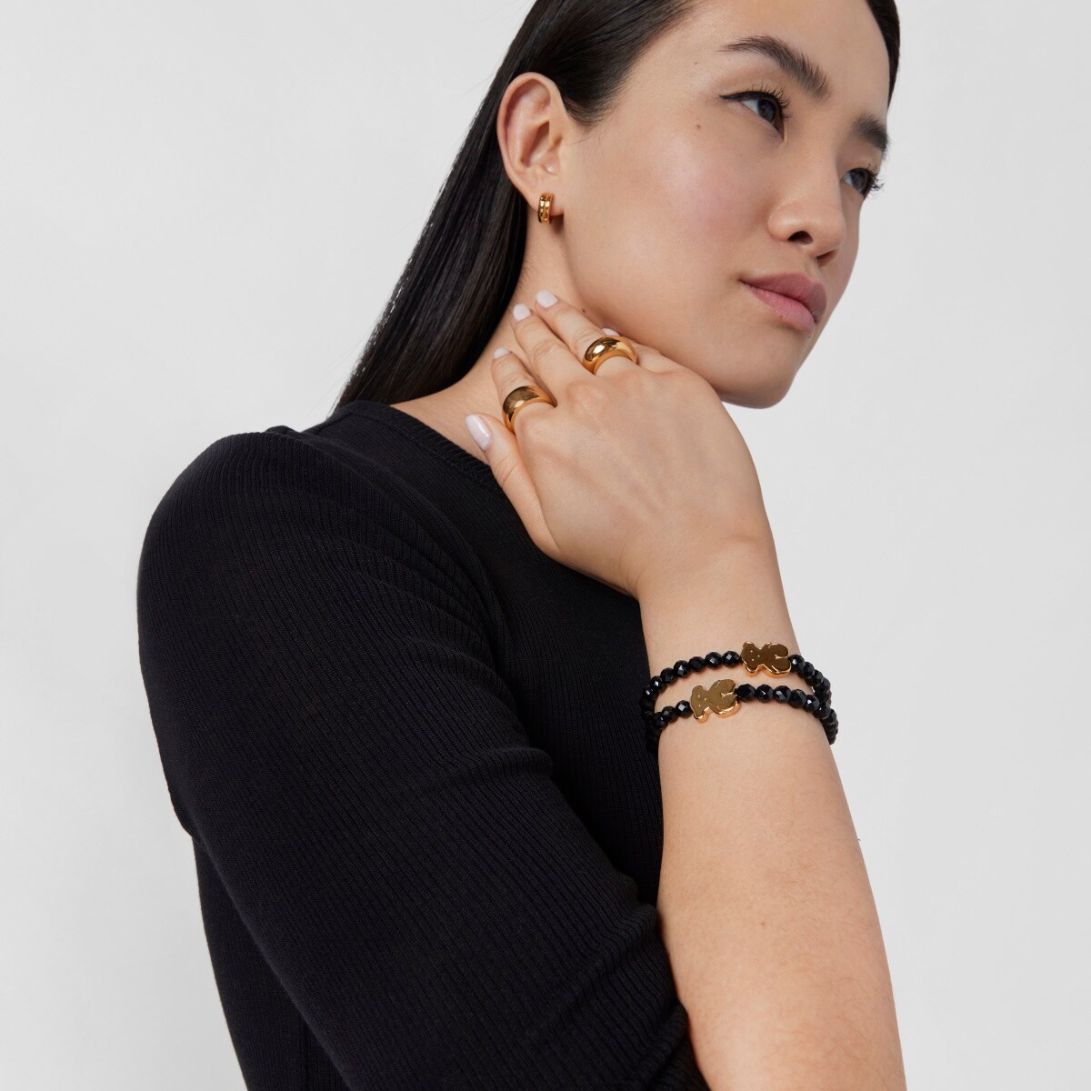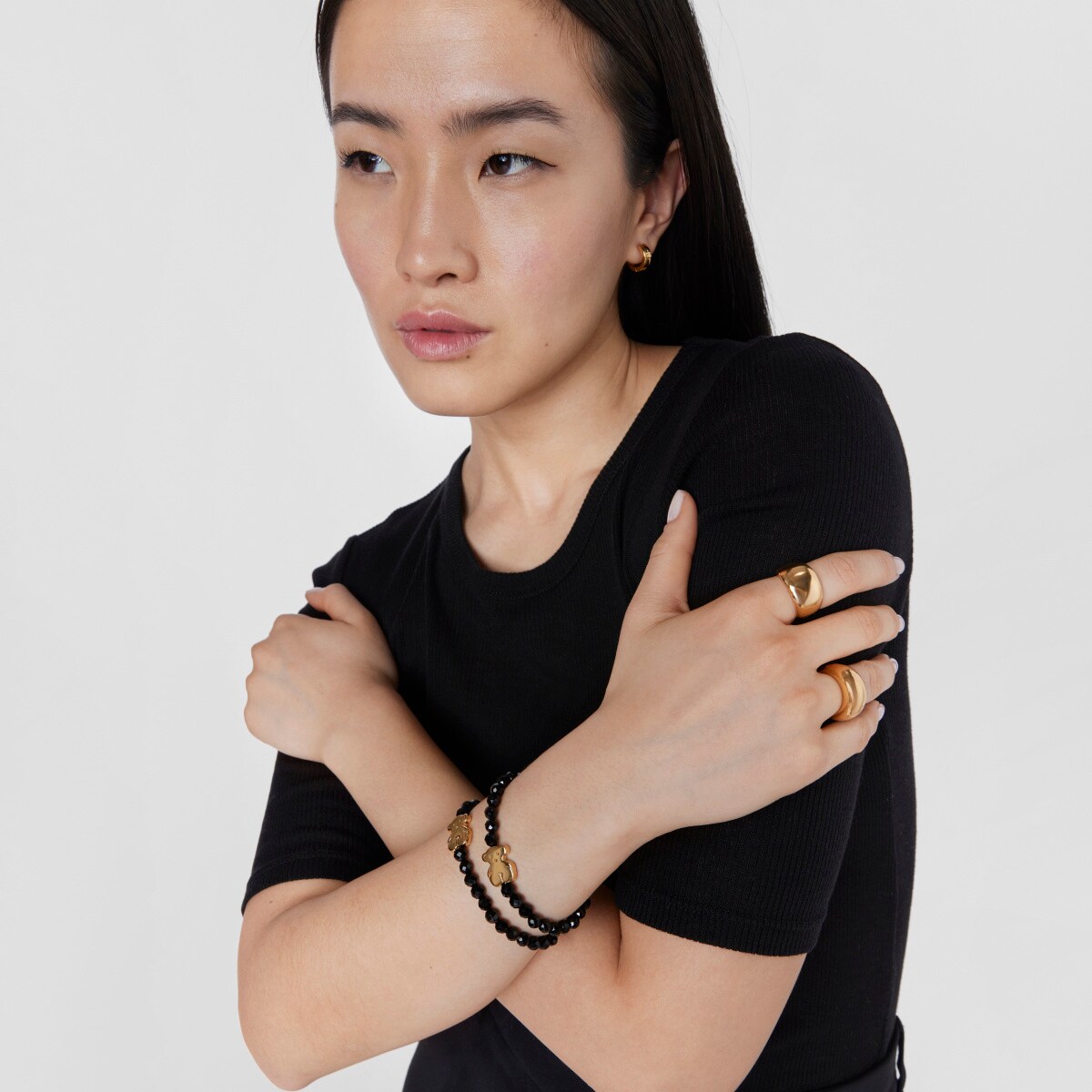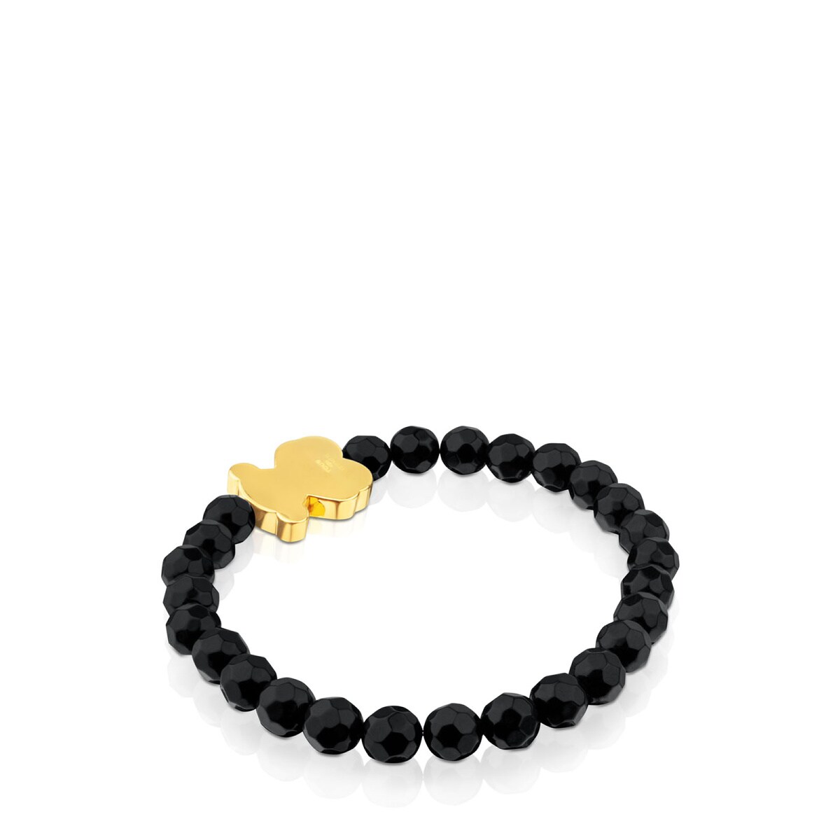 Эластичный браслет из коллекции из вермеля с шариками из оникса 0,6 см. Материал: Вермель – серебро 925 пробы с покрытием золота 750 пробы толщиной от 3 до 5 микрон, без каких-либо иных металлов между ними. Размер медвежонка: 1,6 см.