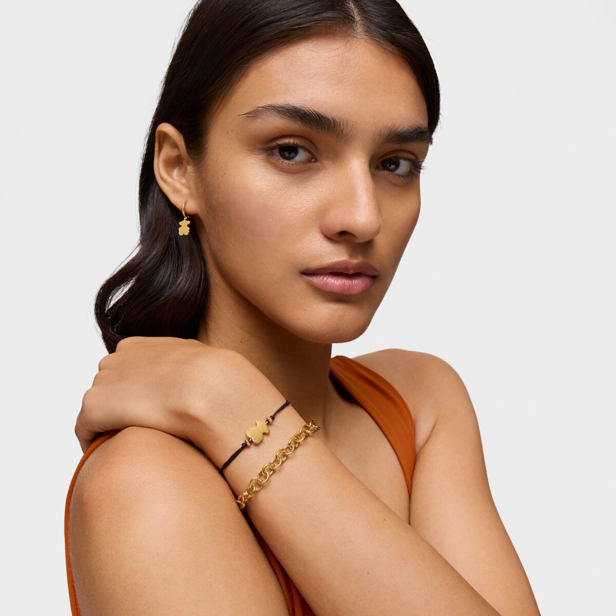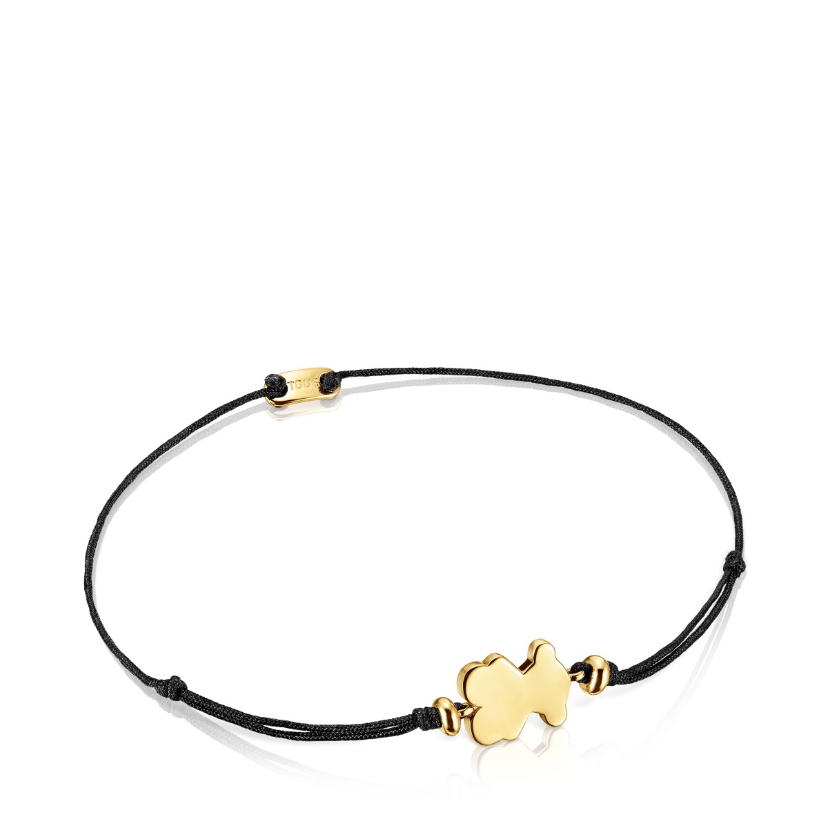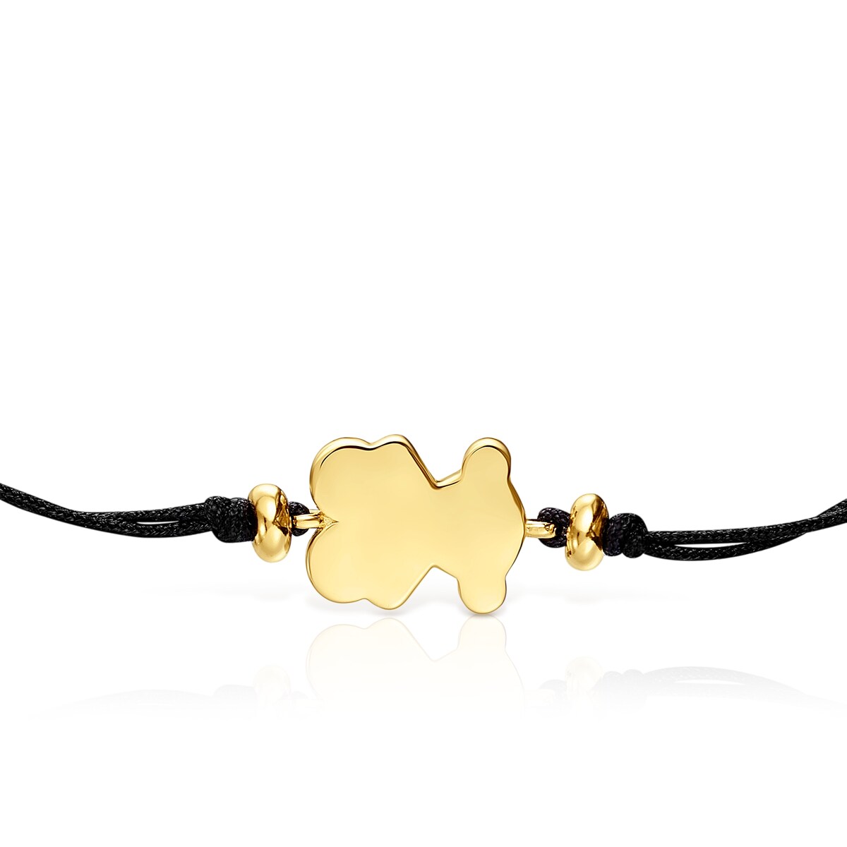 Регулируемый браслет TOUS из коллекции Милые Фигурки (Sweet Dolls) с мишкой из желтого вермеля на черном шнурке. Материал: вермель - серебро 925 пробы, покрытое слоем золота 750 пробы толщиной от 3 до 5 микрон, без каких-либо иных металлов между ними. Размер мишки: 12 мм. Длина браслета: 20 см.