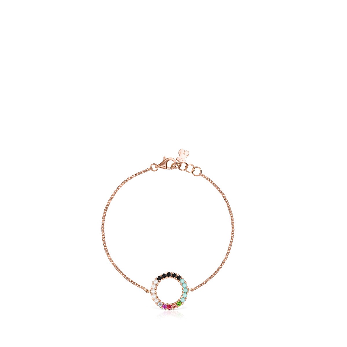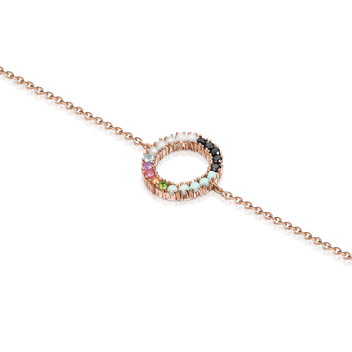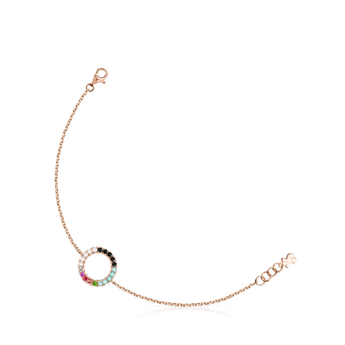 Браслет TOUS из коллекции Straight из розового вермеля с бирюзой, шпинелями, жемчугом, голубым топазом, аметистом, рубином, оранжевым сапфиром и цаворитом. Материал: розовый вермель – серебро 925 пробы с покрытием золота 750 пробы толщиной от 3 до 5 микрон, без каких-либо иных металлов между ними. Размер элемента: 1.6 см.