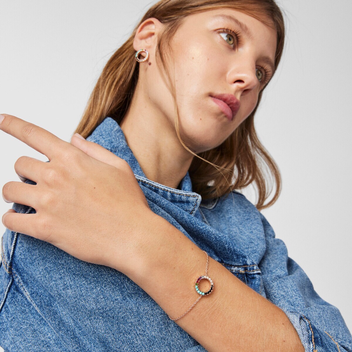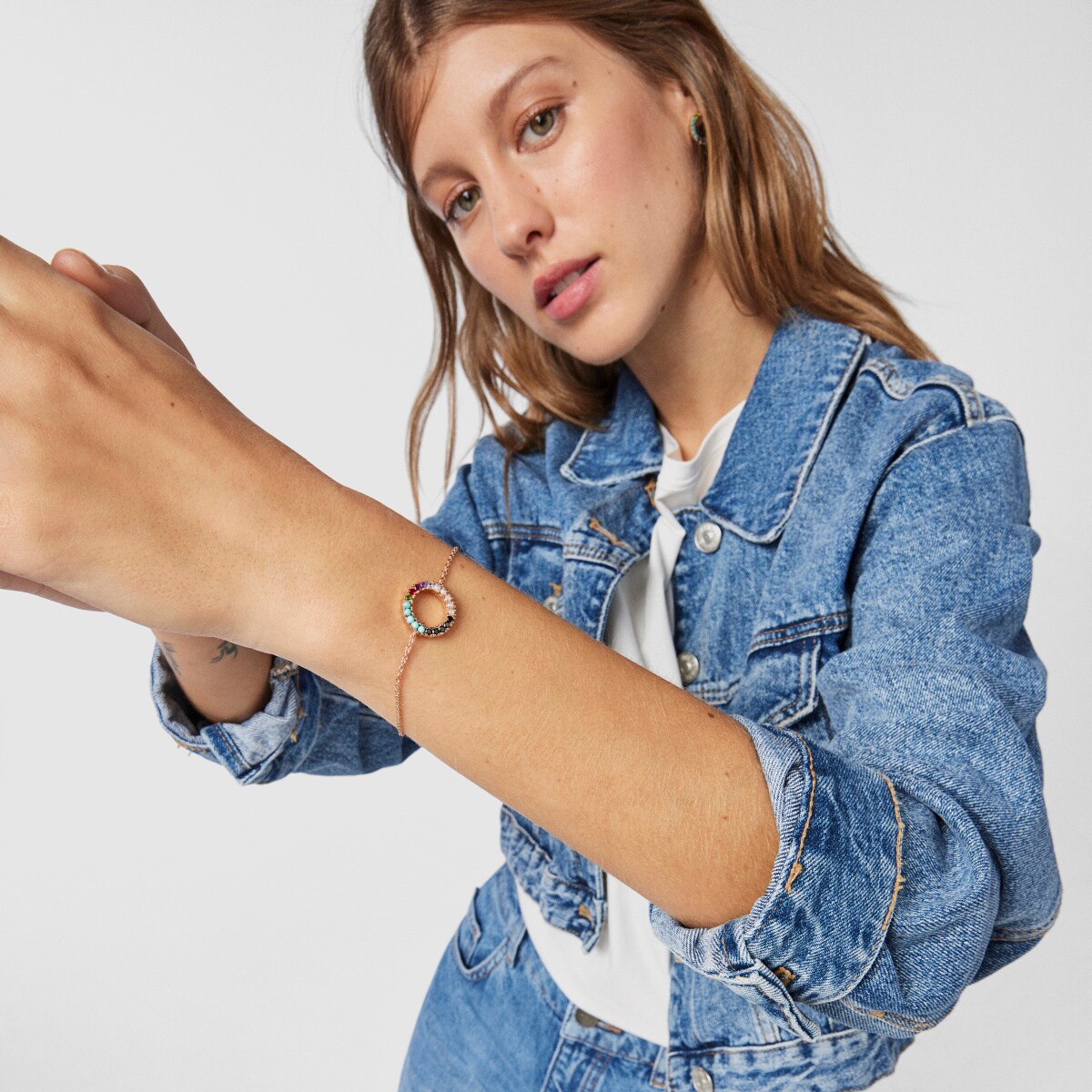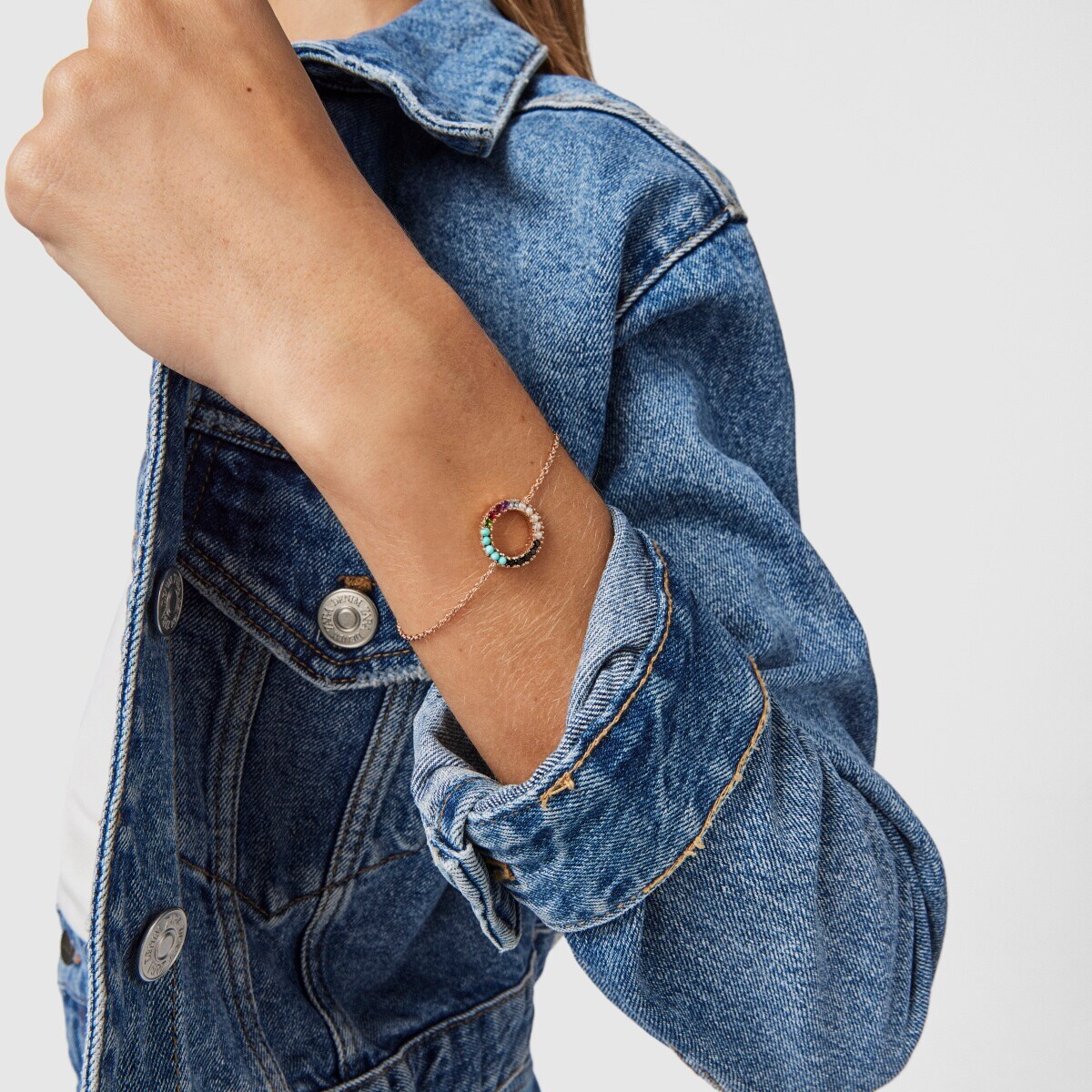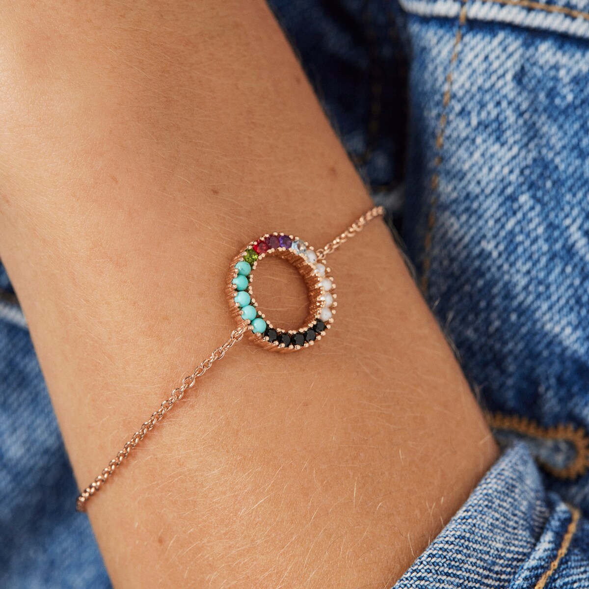 Браслет TOUS из коллекции Straight из розового вермеля с бирюзой, шпинелями, жемчугом, голубым топазом, аметистом, рубином, оранжевым сапфиром и цаворитом. Материал: розовый вермель – серебро 925 пробы с покрытием золота 750 пробы толщиной от 3 до 5 микрон, без каких-либо иных металлов между ними. Размер элемента: 1.6 см.