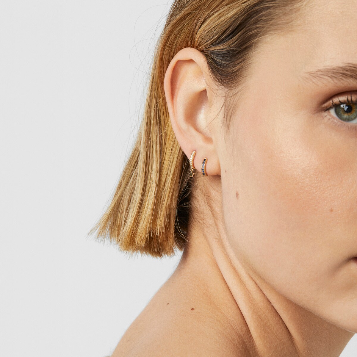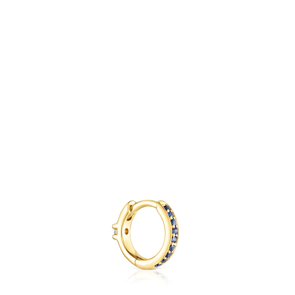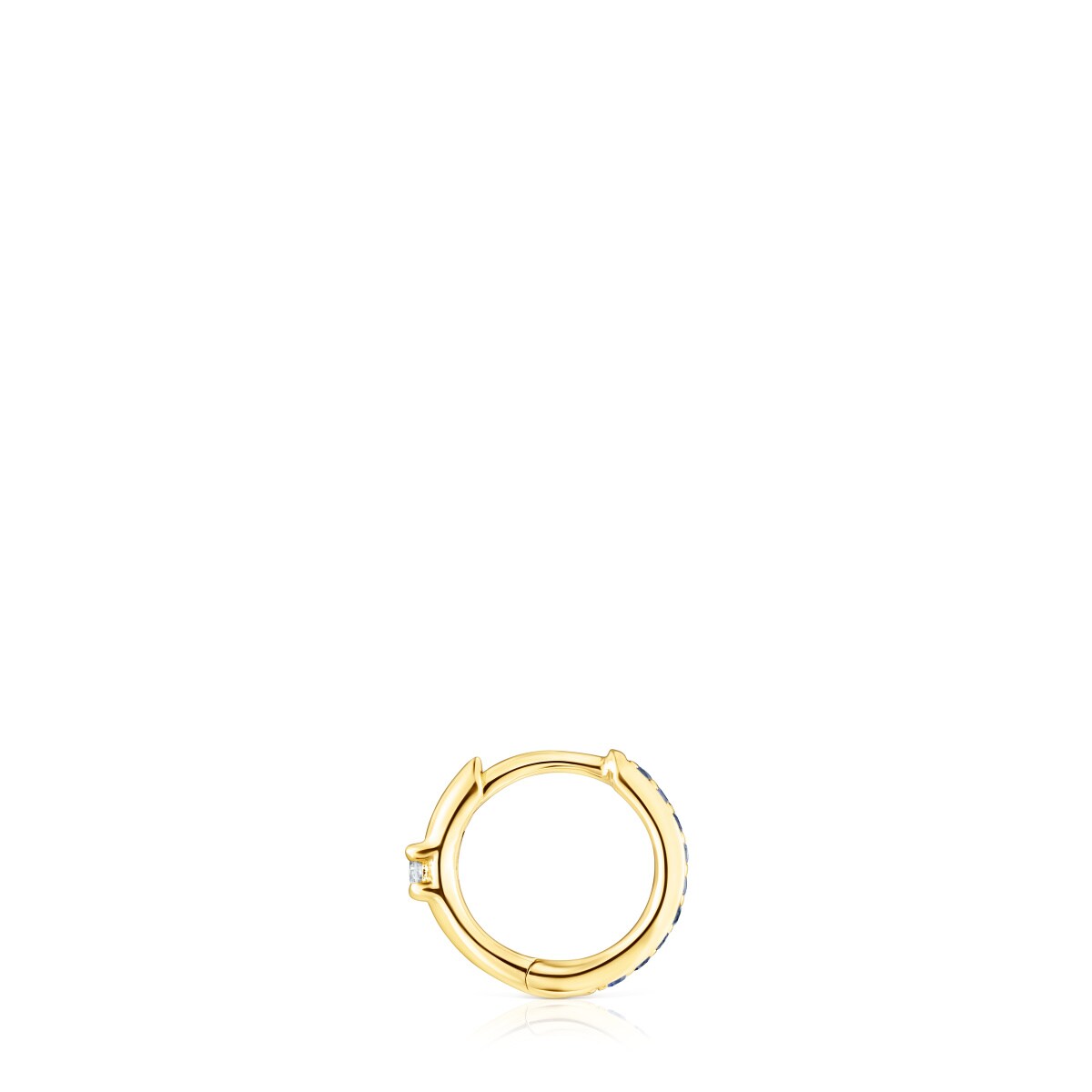 Золотая моносерьга-кольцо TOUS из коллекции Basics с синими сапфирами и бриллиантом классической огранки H/SI весом 0,03 карата. Материал: желтое золото 750 пробы. Толщина: 2 мм. Диаметр: 8 мм.