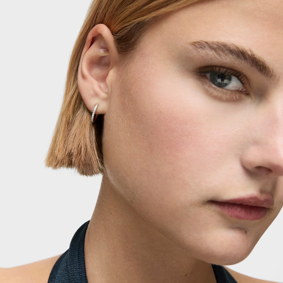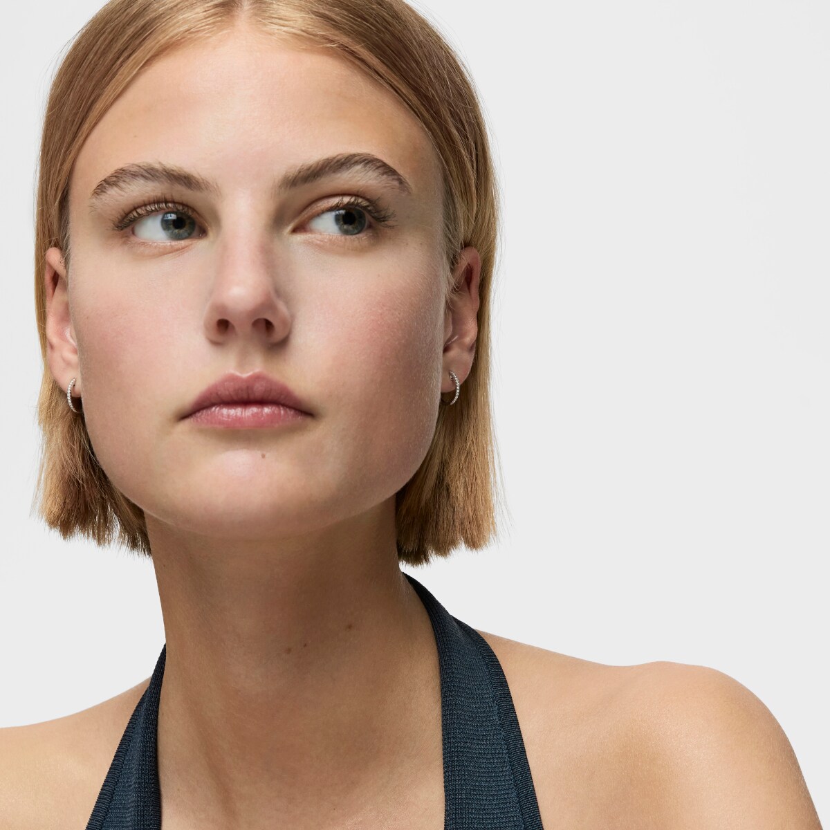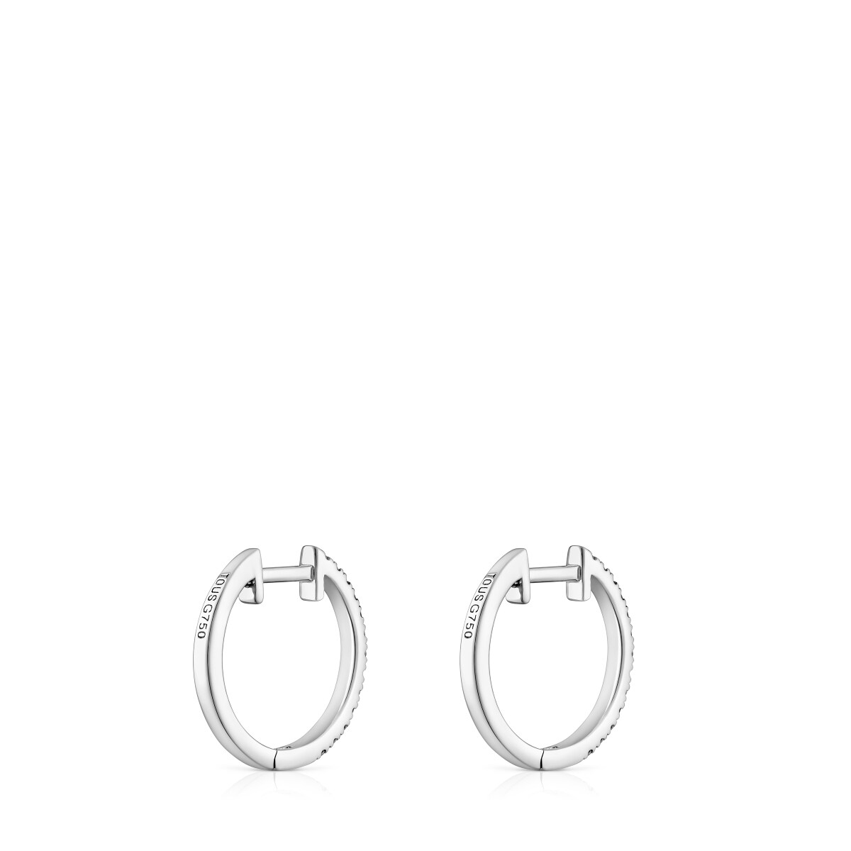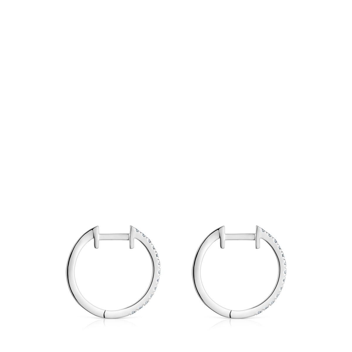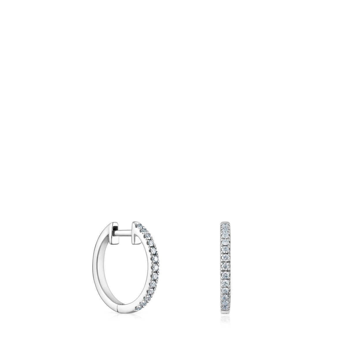 Золотые серьги из коллекции с бриллиантами. Материал: белое золото 750 пробы. Вставка: бриллианты. Общий вес камней: 0,13 карата. Диаметр серег: 14 мм.