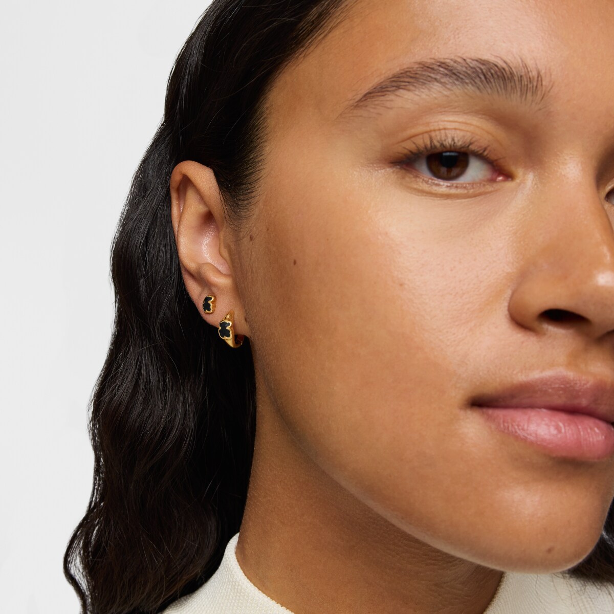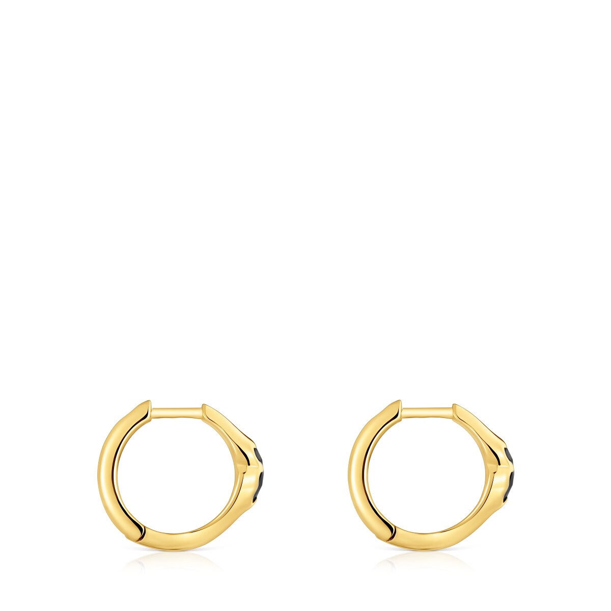 Серьги-кольца TOUS из коллекции Символ Цвета (Icon Color) из желтого вермеля с черным ониксом. Материал: вермель - серебро 925 пробы, покрытое слоем золота 750 пробы толщиной от 3 до 5 микрон, без каких-либо иных металлов между ними. Размер мишки: 6 мм. Диаметр серьги: 10 мм.