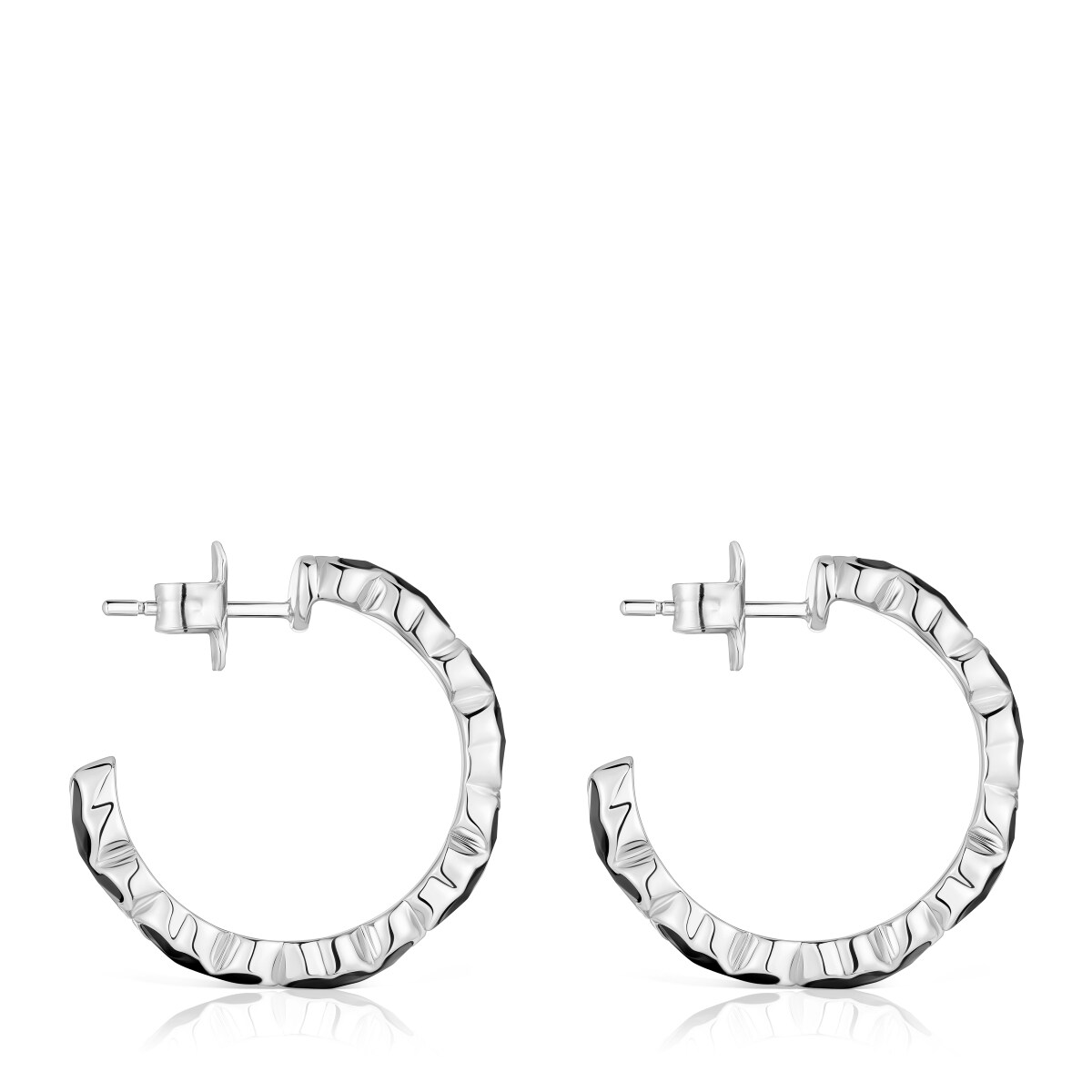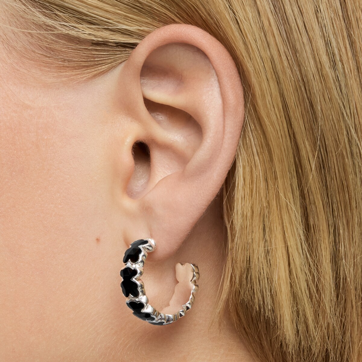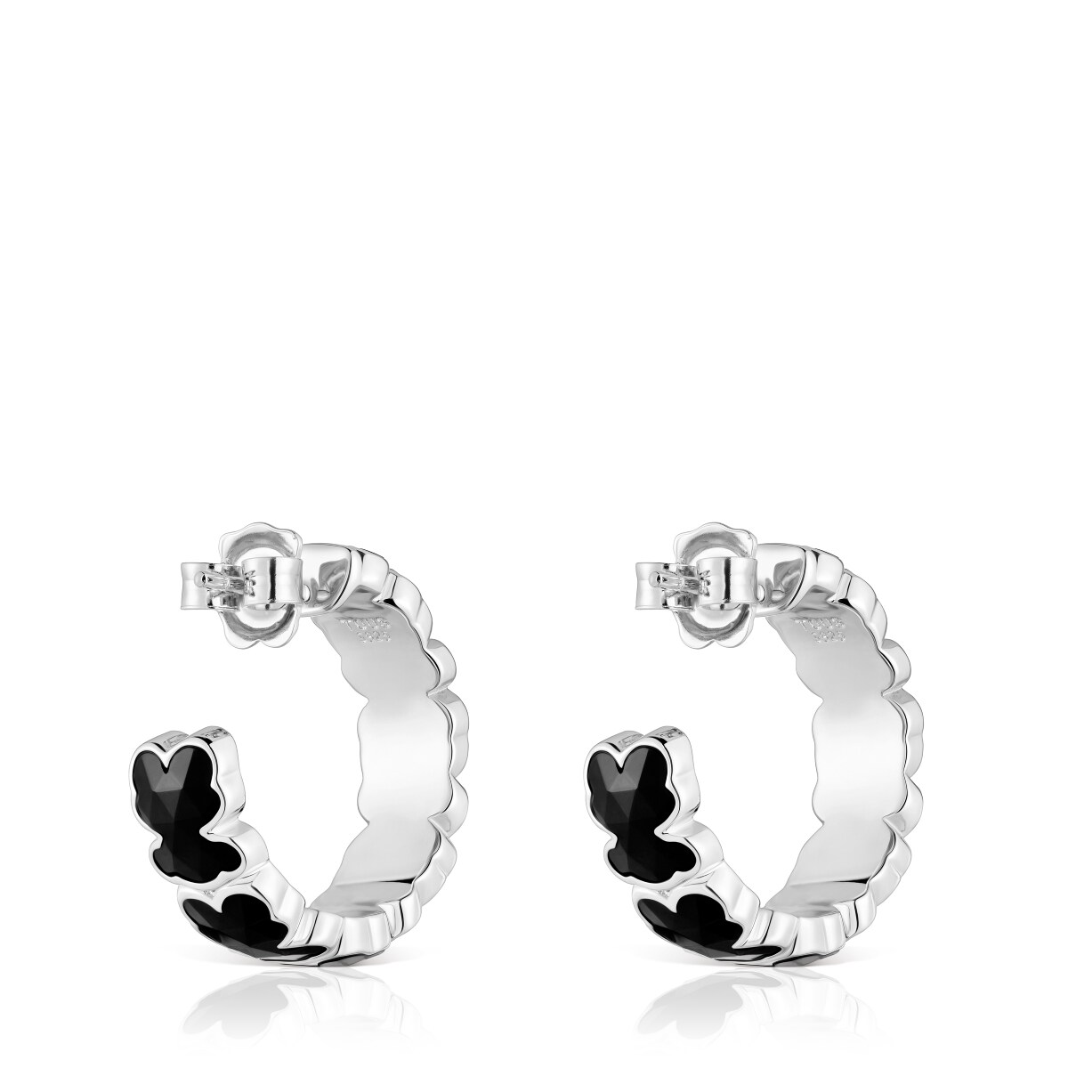 Серебряные серьги-креолы TOUS из коллекции Символ Цвета (Icon Color) с мишками из оникса. Материал: серебро 925 пробы. Размер серег: 18 мм. Застежка - пусет.