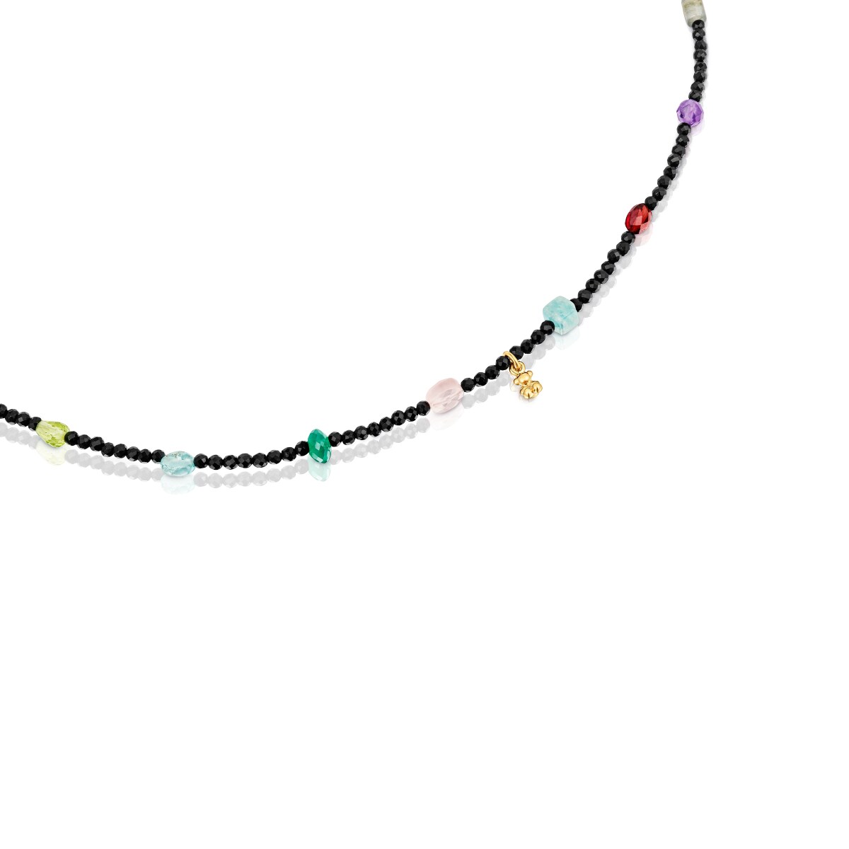 Ожерелье из коллекции с камнями. Материал: желтый вермель – серебро 925 пробы с покрытием золота 750 пробы толщиной от 3 до 5 микрон, без каких-либо иных металлов между ними. Вставки: оникс 2-2,5 мм, гранат 5 мм, амазонит 4 мм, розовый кварц 5 мм, халцедон 5 мм, апатит 5,5 мм и перидот 4 мм. Размер медвежонка: 4 мм. Длина ожерелья: 42 см.