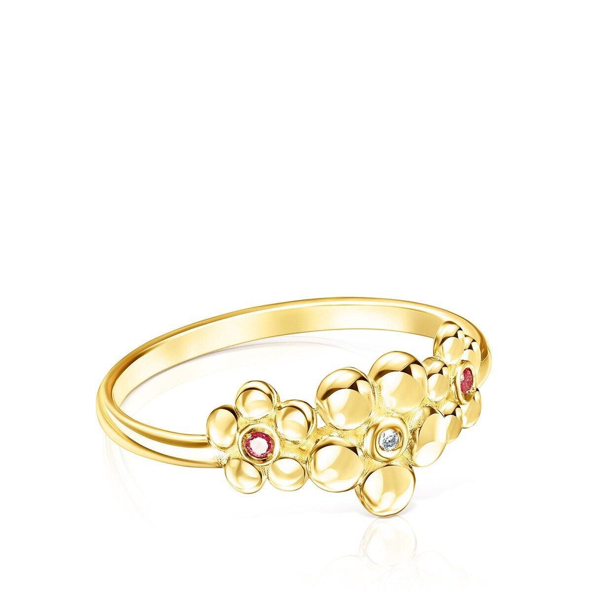Золотое кольцо TOUS из коллекции Fragile Nature с цветами. Материал: желтое золото 750 пробы. Вставка: бриллиант 0,005 кт, H/SI, бриллианта классической огранки и двух натуральных рубинов круглой огранки размером 1,3 мм. Размер цветков: 6-8 мм.